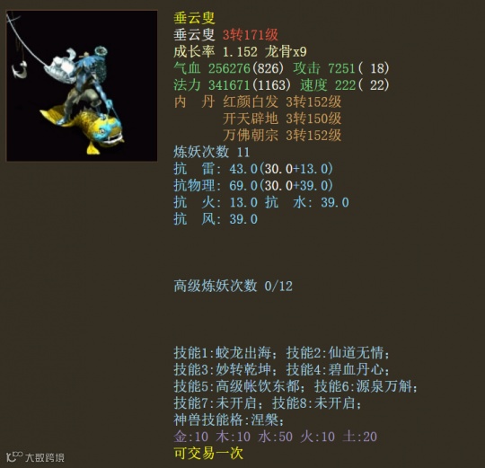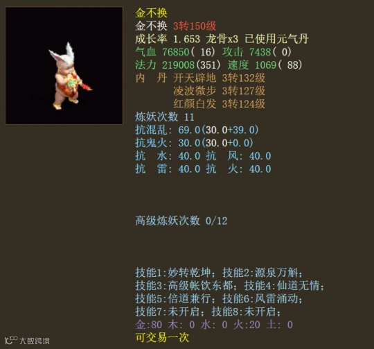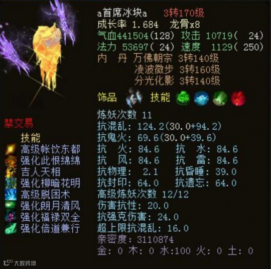 这三种技能的组合,可以应用的宠物太多太多,诸如敏血类的冰雪魔、五叶、冥灵妃子蝴蝶仙子,或是纯血类的天龙女、当康、狐小妖、苍凛等,整整十二项抗性的恐怖属性,加上双血量的叠加和恰如其分的速度提升,让这只坐骑的实用性与地位无可撼动!