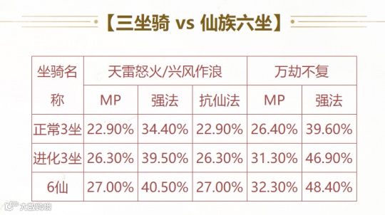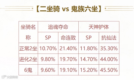再来看三坐骑,这是一只血法类宠物常用的坐骑,神兽垂云叟、天书宝宝罗刹鬼姬、血法加点的妃子等宠物经常用到,进化后的三坐骑和仙族六座在法量、强法、抗仙法这几项属性上已经无限接近,各项属性相较进化前的提升在4%-7%之间,幅度可谓非常之大: