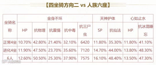 四坐骑的第二个方向,是和人族六座相对应的抗性组合技能,由金身不坏+天神护体+心如止水组成,由于四坐骑的第二个方向和五坐骑相同,这里就合并在一起来说,先看一下提升的幅度和效果: