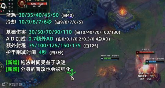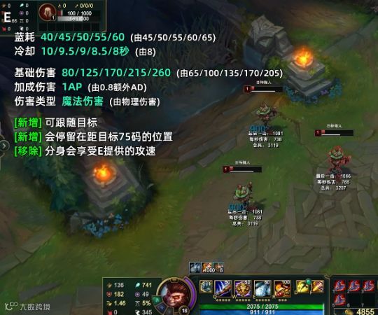优先介绍猴子的W技能也是这次改动的核心机制,猴子可通过释放W技能进行一次300码的位移并获得1秒的隐形效果(可穿墙),分身将会停留在位移处并模范猴子的普攻与大招。在分身持续阶段将会自动攻击敌人,但造成本体30/40/50/60/70%的伤害。由于猴子Q技能效果并未大改,因此分身同样会复制被视为普攻的Q技能,导致猴子在短时间内的爆发会变得十分恐怖。