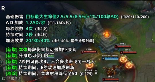 猴子的大招移除了基础伤害,改为每秒造成相当于目标最大生命值2.5/5.5/8.5%(+1%/100总AD)的物理伤害,提高了猴子后期对于敌方坦克英雄的威胁能力。持续时间被缩短为2秒,但每秒跳数则由2提高至4,总的来看伤害能力略微下调了一点。