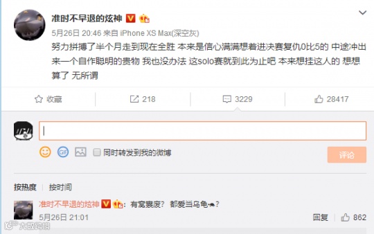 之后炫神在微博表示,努力拼搏了半个月全胜,没想到中途冲出来了一个自作聪明的贵物,本来还想要挂这个人的,后来想想算了无所谓。并在评论区留言,有窝囊废?都爱当乌龟?希望官方出来跟自己对线。