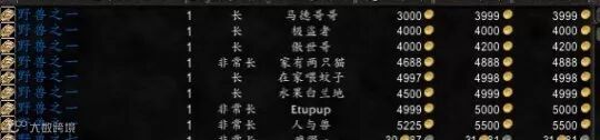 显然这只是新道具的初期状况,和厄运刚开时的屠龙纲要一样,野兽之一的价格跌得很快,现在各服应该都是几百到一千金的样子。但有的服务器里,有些大地精混淆视听,野兽之四也挂个1000金来迷惑粗心大意的玩家。