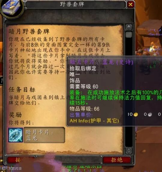 套牌是暗月马戏团活动期间才能刷的物品,一共有四套,每套八张,副本里的精英怪会掉落这些卡牌,凑齐一套之后就能直接做出套牌饰品。这次最受关注的套牌是野兽套牌,这套牌凑齐之后可以制作出蓝龙饰品,饰品特效对于法系职业非常有用。