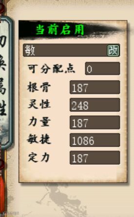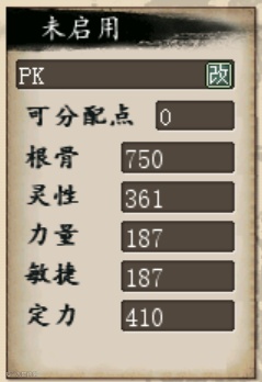 在PK的场合中,女人更多是作为血队防守反击的角色,再加上装备本身对根骨的要求,所以加点以根骨为主,以下面这位女人为例,750点的根骨、410点的定力、其余的分配给灵性,保证被抽之后也可以释放法术,同时拥有不错的抗打击能力。