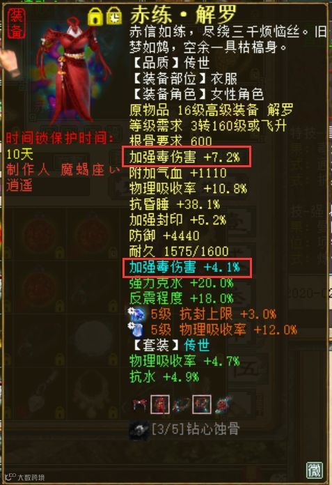 在选择装备时,带“加强毒伤害”的装备例如武器、衣服帽子等,尽量选择属性更高的、而像是项链、鞋子这些本身不带加强毒伤的装备,那就以高强力克为主,高强毒伤+高克,最终呈现出来的伤害效果也就越高,而后利用套装的加成,特技的加成(曼陀罗造成毒法伤害)、天演策效果的加成等,多方位烘托出一个强大女人应有的形象。