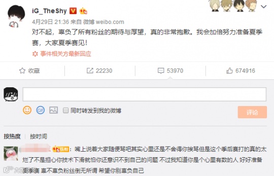 面对网友的口诛笔伐,The Shy也在比赛结束后一个多小时,正面回应了自己的发挥。向所有粉丝道歉,认为自己辜负了他们的期待与厚望。将会加倍努力准备夏季赛,大家夏季赛见!