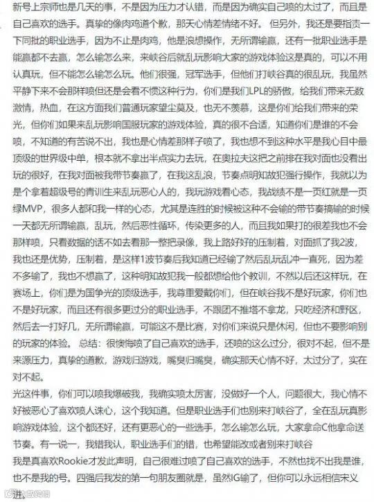 经过网友们的不懈举报,这名玩家目前已经被封号。近日,他在发现自己嘲讽的中单真的是rookie之后,在贴吧发布了一篇长文来向rookie道歉。