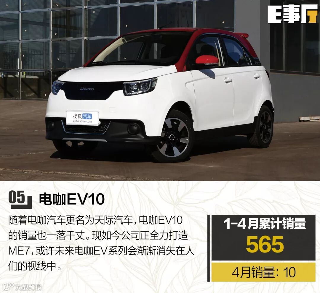 2015年成立的电咖汽车在4月被上海电气注资后正式更名天际汽车。在天际ME7没有交付前,天际的产品线现今主要靠2017年底上线的电咖EV10维持。