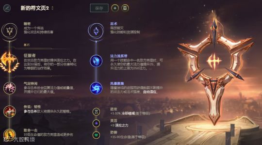 具体的天赋加点分别为:主系征服者来提供伤害加成与回复能力,气定神闲来提供瑞兹的法力值上限并对于技能伤害进行加成,传说韧性来增加瑞兹的坦度,通过致命一击进一步来扩大瑞兹的爆发伤害。