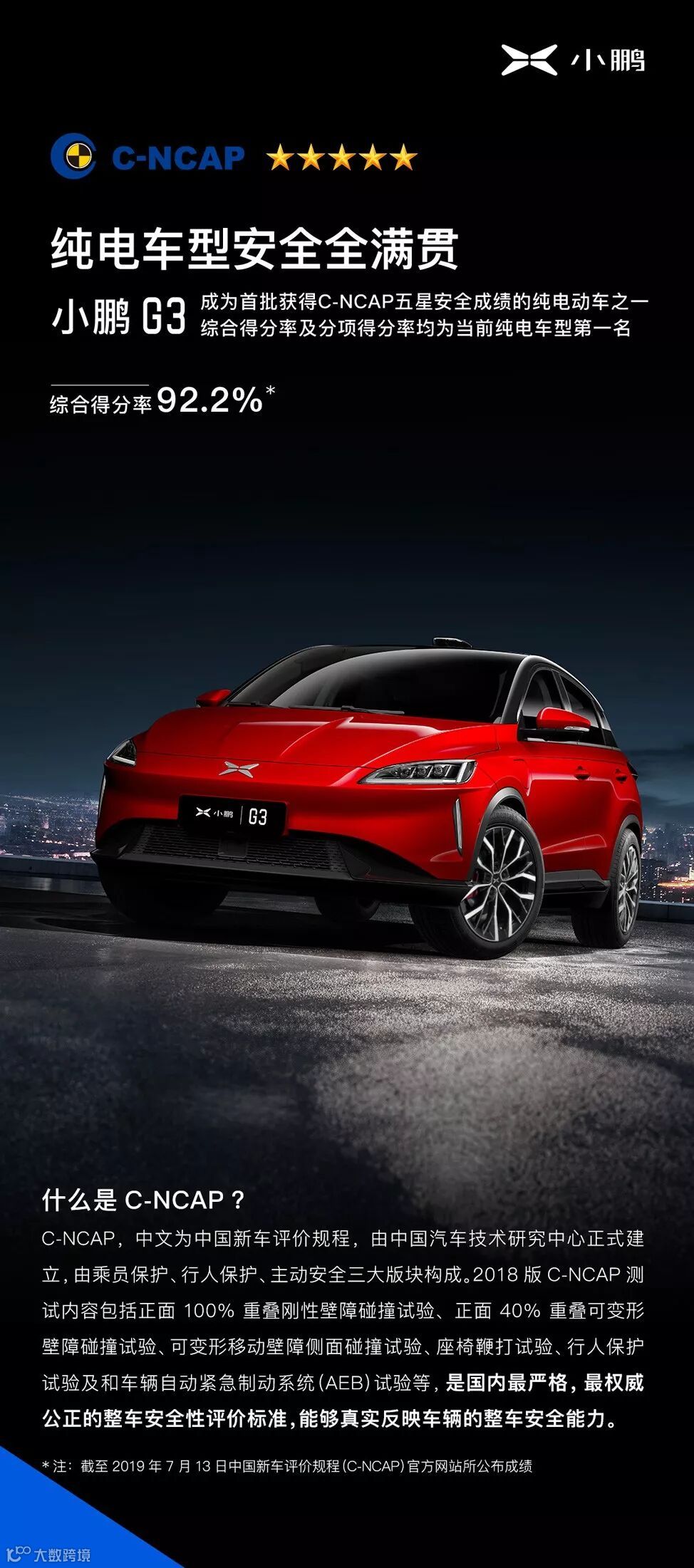 近日,2019年第二批中国新车评价规程(C-NCAP)测试结果公布,小鹏G3以综合得分率92.2%获得C-NCAP测试五星评价,成为2018版C-NCAP测试规则发布后,首批参与测试并获得五星评价的纯电动车型之一。