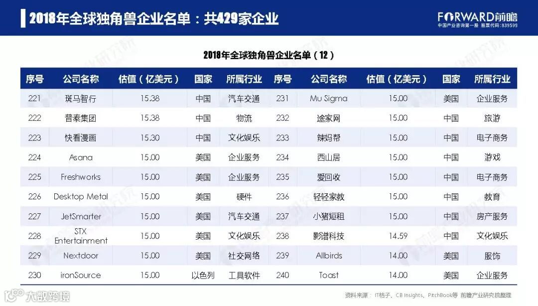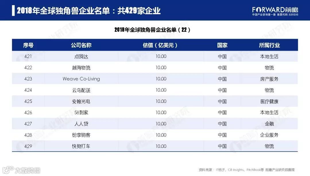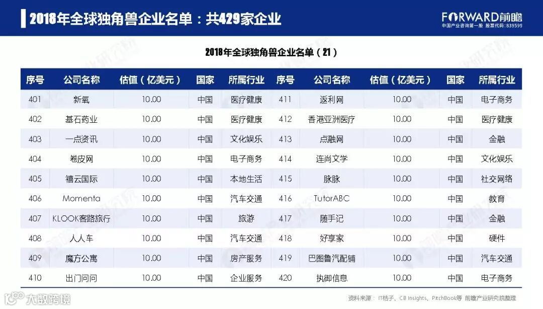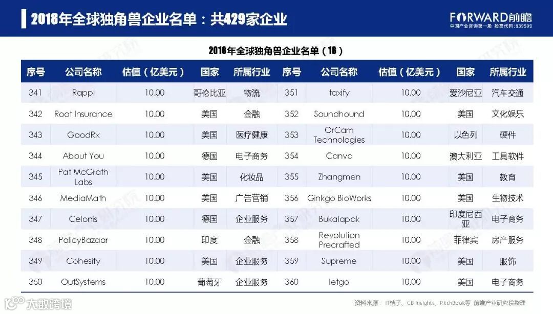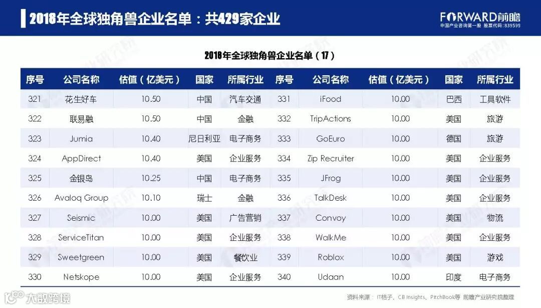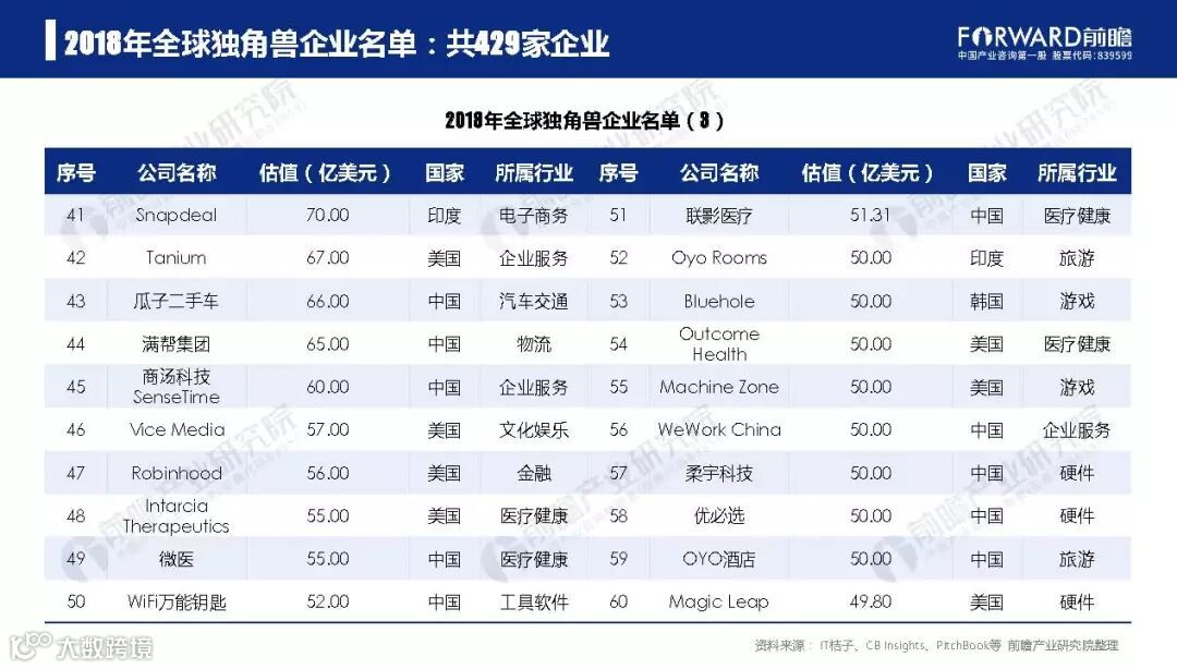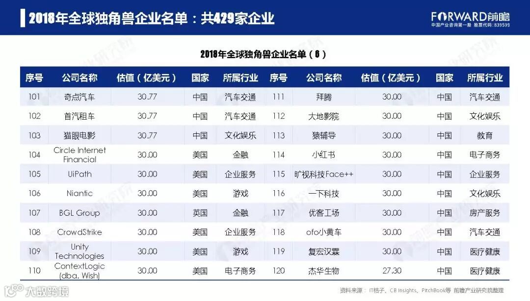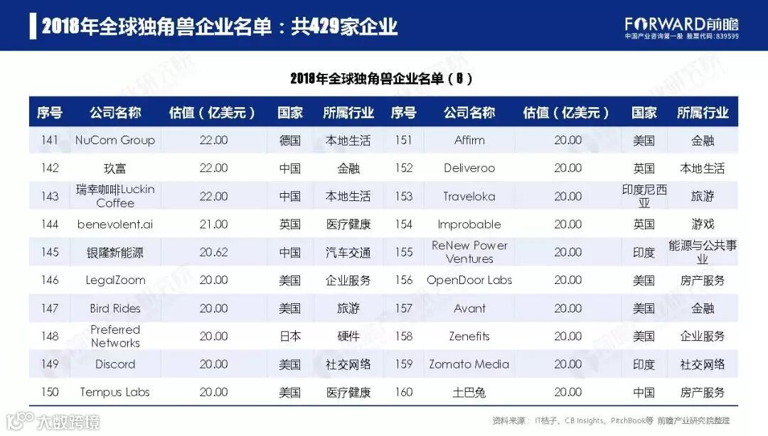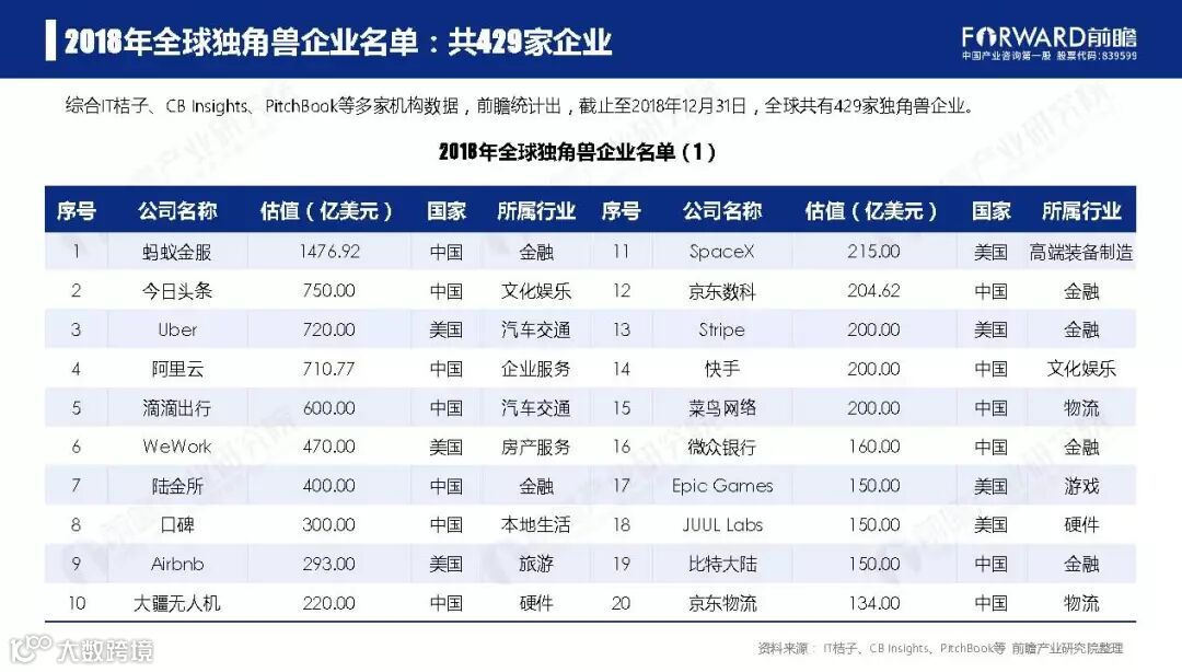 从2018年全球独角兽企业地域分布情况来看,中国数量第一,共205家,占比47.79%;美国数量第二,为149家,占比34.73%;中美两国独角兽累计估值占全球总比的88.83%。以下是前瞻整理的《2018年全球独角兽企业完整榜单》,综合IT桔子、CB Insights、PitchBook等多家机构数据,前瞻统计出,截止至2018年12月31日,全球共有429家独角兽企业。