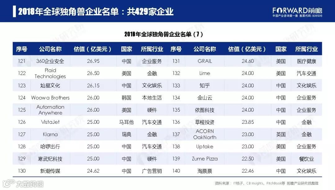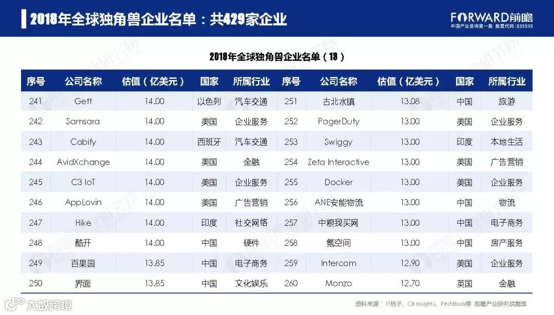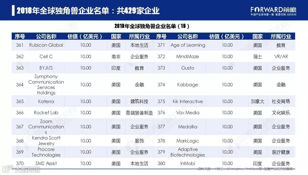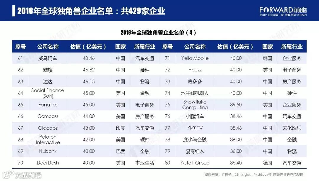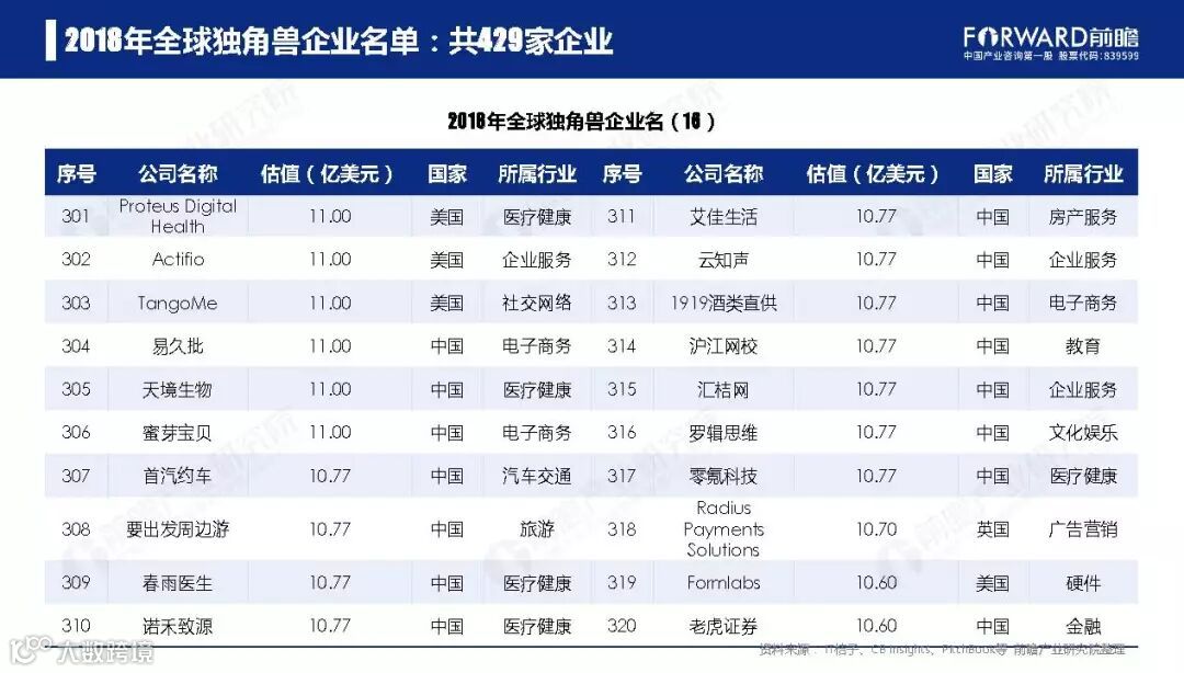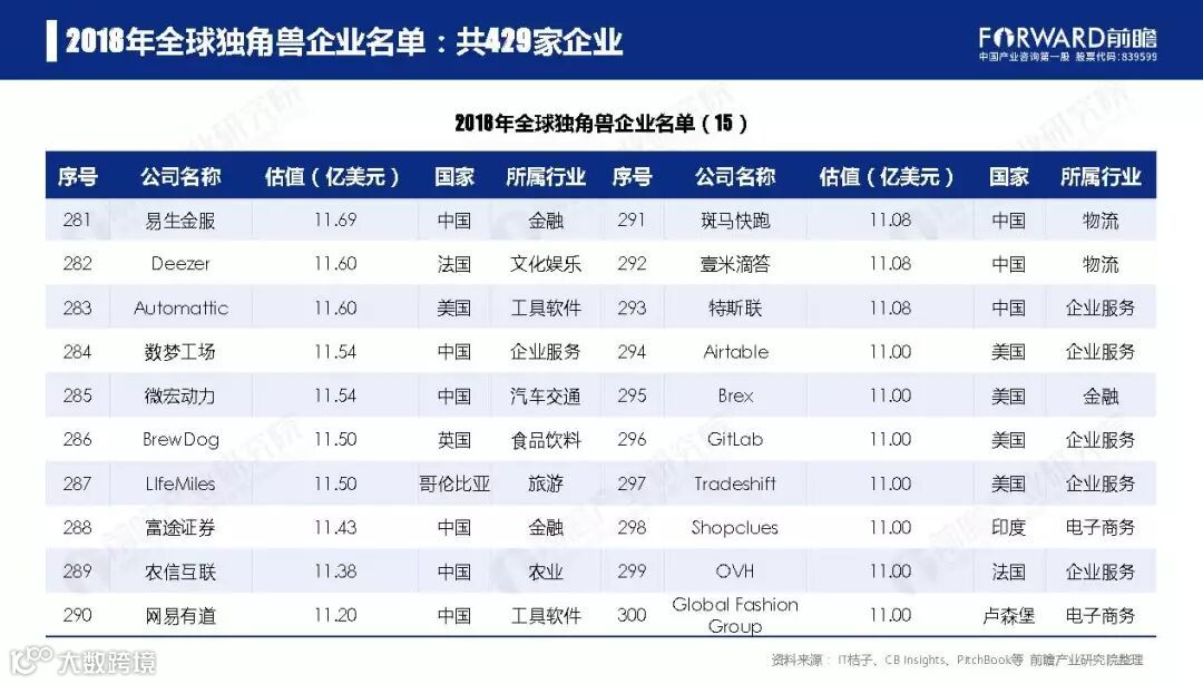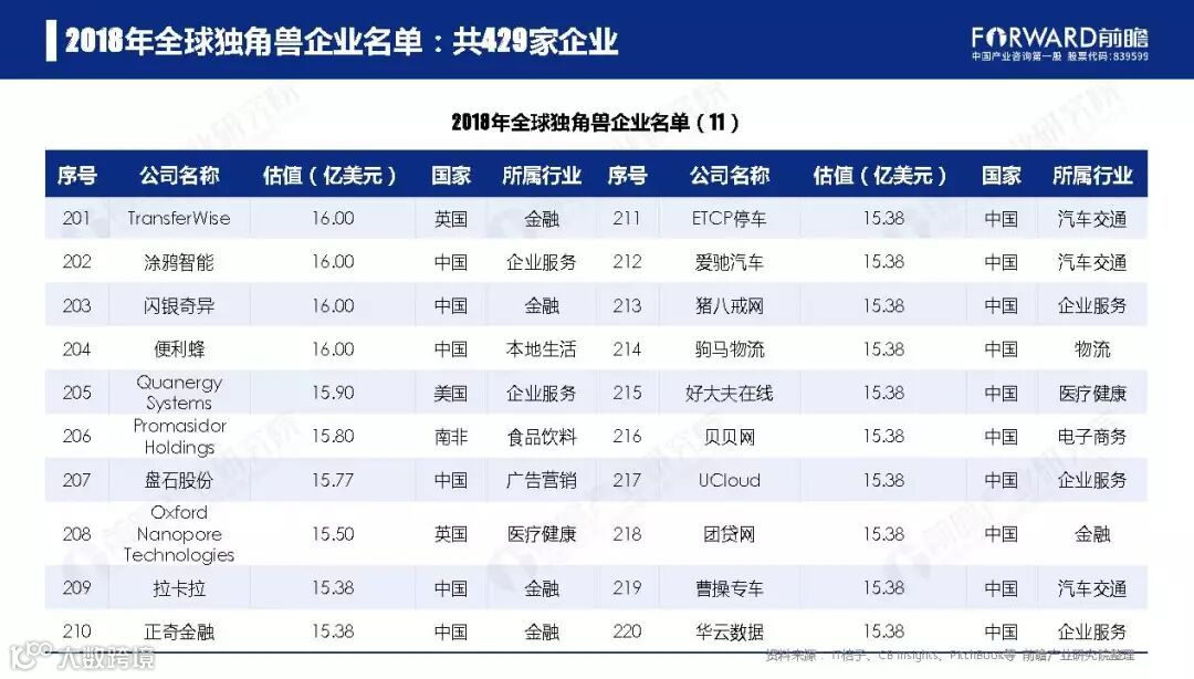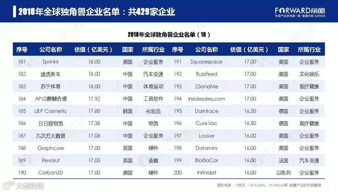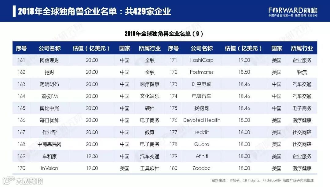 从2018年全球独角兽企业地域分布情况来看,中国数量第一,共205家,占比47.79%;美国数量第二,为149家,占比34.73%;中美两国独角兽累计估值占全球总比的88.83%。以下是前瞻整理的《2018年全球独角兽企业完整榜单》,综合IT桔子、CB Insights、PitchBook等多家机构数据,前瞻统计出,截止至2018年12月31日,全球共有429家独角兽企业。