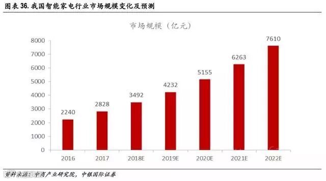 根据中商产业研究院的数据,2017年中国家电行业市场规模达到了7740亿元,其中,智能家电行业市场规模为2828亿元,占比达36.54%,预计2022年智能家电行业规模将达到7610亿元。