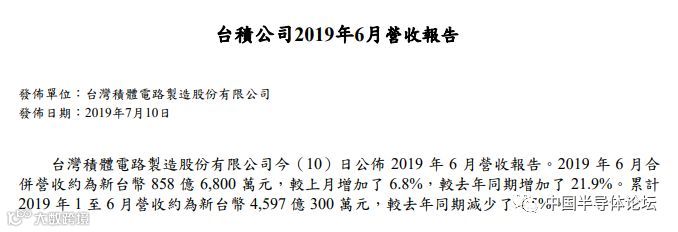 6月份,台积电销售额为858.7亿新台币(约合人民币190亿元)同比涨幅达到21.9%,这是台积电连续6个月(2018年12月-2019年5月)业绩同比下滑后的首次增长。