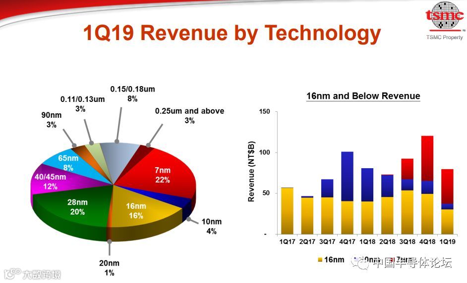 目前,全球芯片量产的最先进制程是7nm,全世界只有台积电和三星有能力生产7nm芯片。台积电7nm技术自2018Q3开始持续放量,在2019Q1贡献了营收的22%,成为台积电最一大营收主力。