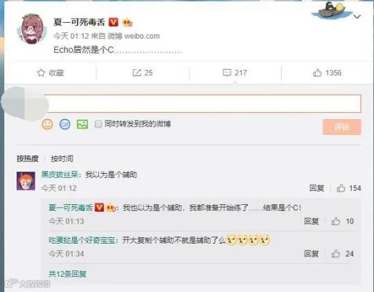 看到新英雄回声定位是个输出,很多玩家都表示一脸懵逼。知名主播夏一可更是在微博上发出了灵魂拷问:Echo(即回声)居然是个C...辅助玩家们纷纷透露出了非常失望的想法,夏一可算是说出了玩家们的心声——我都准备开始练了,结果暴雪你告诉我回声是个C?