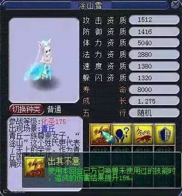 飞升125新召唤兽,携带2个必带技能,最高5技能,可以想象这个召唤兽以后很大可能取代天科的画魂,毕竟是5技能,容易出多技能。