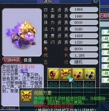 蓝胖子“谛听”是化圣175才能携带的召唤兽,应该属于稀有召唤兽,资质偏向于法术,没有必带技能。特殊技能“观照万象”是最变态的技能,但是该技能只有“谛听”能应有,如此一来其他召唤兽无法通过炼妖获得。