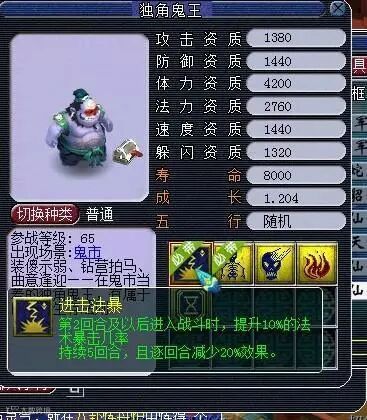 65级新召唤兽,独角鬼王,如果突破是真的话,那么雷鸟人怕是要被更新一波了。资质比起雷鸟人高上不少,带2个必带技能,还有一个“进击法暴”这实在有点给力了。