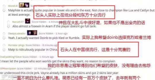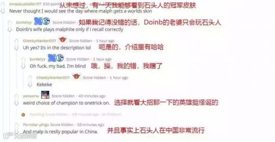 大部分国外玩家都不愿意看到石头人的冠军皮肤出现,他们认为在决赛中怪物泰坦以及爆炸输出的瑞兹更值得Doinb去选择,而不是只在小组赛中出现过、表现十分糟糕的石头人。