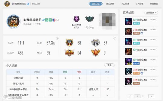 小龙堡的国服峡谷之巅账号也以64的胜率冲到了大师,这其中还有很多场游戏他在直播没有认真玩。