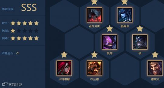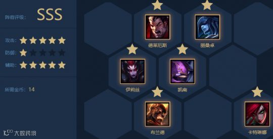 诺手、卡特、德莱文、乌鸦、凯南、火男、冰女、猪女(8人口完美阵容)