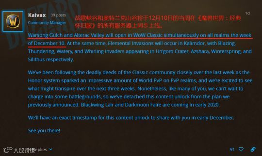 最近,暴雪官方蓝帖带来了一个好消息:奥山和战歌这两个战场将于12月10日在所有服务器上开放。