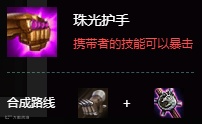 珠光手套由格斗手套与无用大棒合成,能提供20点法强与20%的暴击率,并且能使得携带者的技能伤害可以产生暴击,当然这个暴击概率也基于携带者自身的属性。