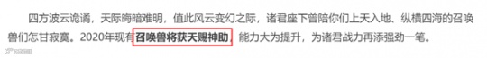 接着再看这一条,话说召唤兽灵犀刚刚改动,这2020年又有新的变化了?“天赐神助”这四个字,可能是一种召唤兽专属的BUFF,也可能是一种新的固定能力,大家不妨开开脑洞,除了内丹、技能、觉醒、灵犀之外,召唤兽还可以加入些什么?