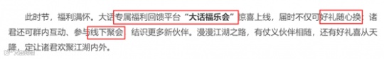 最后,“大话福乐会”这个平台将会在2020年上线,从计划预告中可以看出,这完全就是一个福利回馈的平台,是专属于大话玩家的福利平台,或许会以积分等方式换取游戏内外的礼物,道具周边什么的相信一定不会少咯!