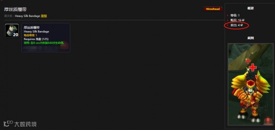 丝绸是在WOW里30级-40级区域里最常见的掉落材料,现在国服怀旧服里大部队的等级正好在这个阶段,所以服务器里的丝绸量是很大的,拍卖行里上架了大量丝绸,让玩家们找到了一个生财之道,这个生财之道的关键点在于一个急救制品——厚丝质绷带。