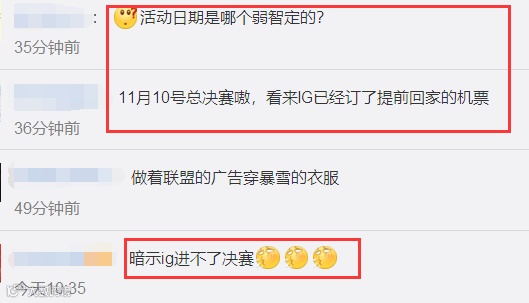 “太秀了吧默认自家战队进不了决赛,四强赛还没开始打,和GRF管理层的虚空对线已经开始了”“11月10号总决赛嗷,看来IG已经订了提前回家的机票。”“暗示IG进不了决赛。”