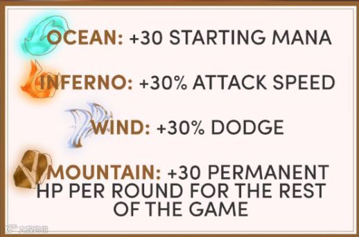 分别为:海洋:+30点起始法力值;炼狱:+30%攻速;风云:+30%闪避几率;山岩:+30永久生命值每回合,直到游戏结束。
