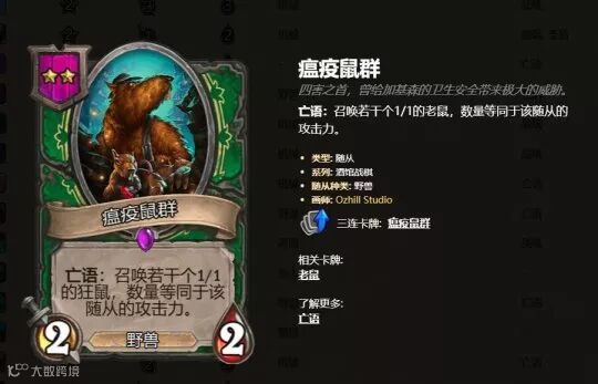在前期的时候,我们可以要尽快找到瘟疫鼠群这张牌,它的亡语召唤出来的狂鼠能够在一定程度上减缓我们的血量压力。