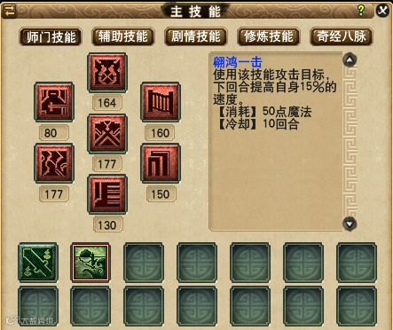 翩鸿一击是一个很好的补刀技能,而且下回合能提升15%速度,更有利于点杀。不过技能和经脉跟“扶阵”无法一起点,所以比赛上很少使用到这个技能。