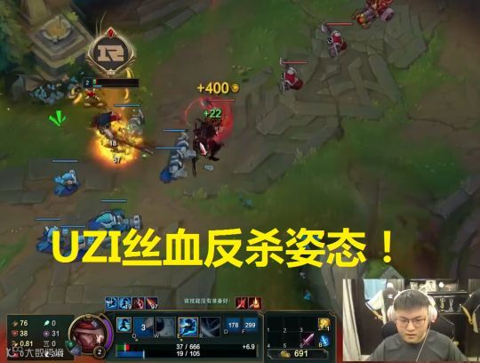 2级后姿态看有机会杀掉UZI,攒完风直接就闪现吹起UZI然后引燃,不过自己扛了一下塔,UZI看到后直接也闪现Q吹起姿态接引燃将姿态反杀,最终因为凯旋的回血没有死,气的姿态直接手舞足蹈了起来。