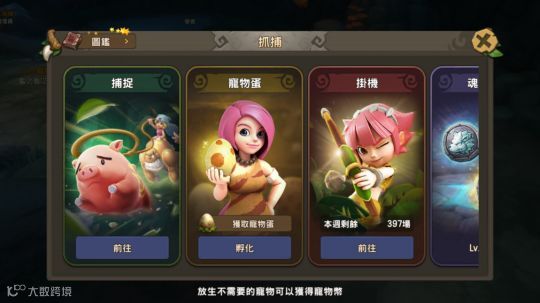 ▲依等级逐步开放宠物蛋孵化、捕捉、挂机、AR抓捕等捕捉方式。