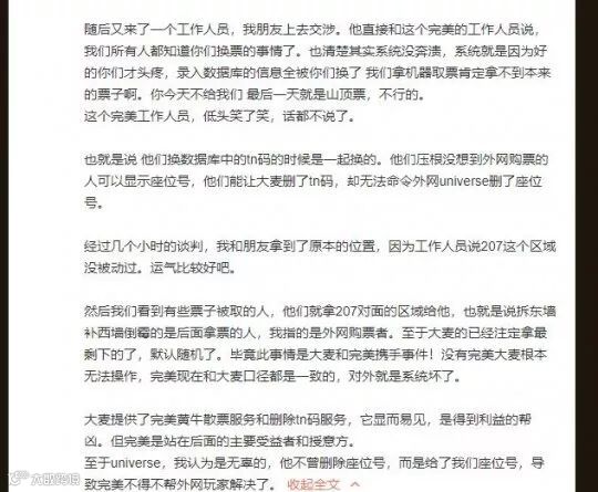 此次事件的导火索,在于这名爆料观众是从外网买的票。和国内观众不同的是,univers可以看见自己的区域和座位号。