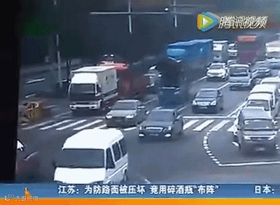 由于奥迪刹车比较急,后面的货车也跟着急刹车,但货车运载的毛竹却由于惯性全都向前掉了出来,导致毛竹直接插入在奥迪中。