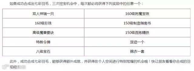 Hello小伙伴们晚上好鸭,今年的七夕羽毛合成玩法,大家觉得好玩吗?每合成一根七彩羽毛,将有3次挖宝机会。三次挖宝机会中,每次都必将获得下列奖励中的任意一个: