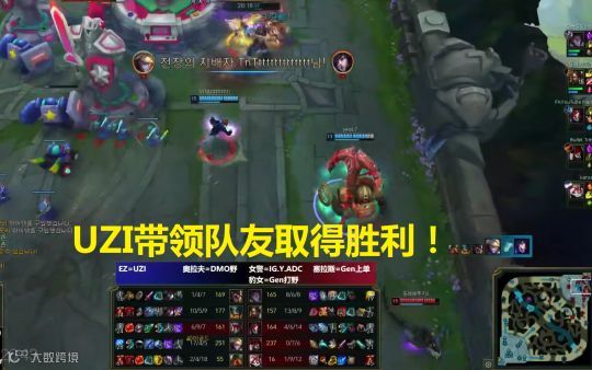 UZI看了看安妮表示:这局还是由我来终结他们吧!UZI带着队友推上了对面高地,这局游戏已经结束了,还是小狗开始carry了,虽然有安妮BUG无限晕,但还是得UZI来接管游戏的。