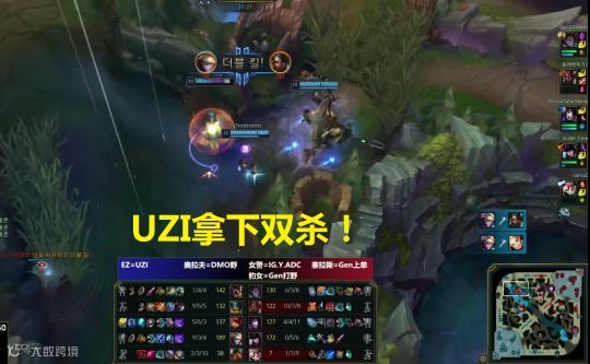 后续UZI在上路河道草里蹲到了在刷河蟹的豹女和光辉,小狗一个人击杀了对面两个人,拿下双杀!对面野辅阵亡,队友果断开大龙。