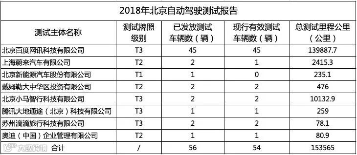 2019年3月31日,北京市对外发布了“2018年度自动驾驶车辆道路测试报告”,首次向外界公布了北京地区的自动驾驶企业,在这边的路测情况。包括车队数量,测试里程,以及获得的在公开道路上的测试牌照的等级。