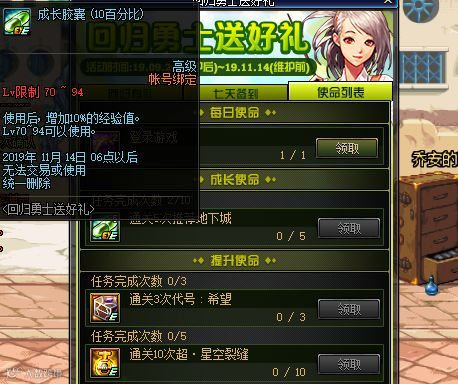 通过冒险团界面,满级大号的疲劳消耗与刷图每日可以领取大量的成长胶囊,帮助小号快速升级。如果你是一位回归玩家的话,还可以通过每日通关五次推荐地下城的方式来获得5枚10%的成长胶囊。
