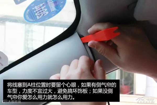将线塞到A柱位置时,我们就要看情况操作:对于配备了A柱侧气帘的车型,其侧气帘位置的饰板会比较软,我们在布线时要特别小心,操作力度要控制得当,避免搞坏饰板;而没有A柱侧气帘的车型,我们直接将线塞进去就行了。我们这次用来演示的车辆没有配备侧气帘,在A柱硬软两款饰板间缝隙将线塞进去就行了。