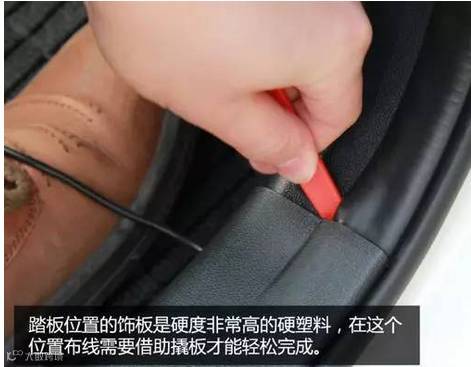走线继续到右前门踏板中间的位置,寻找空隙将线穿出来。由于踏板位置的饰板都是硬度非常高的硬塑料,在这个位置布线需要借助撬板。