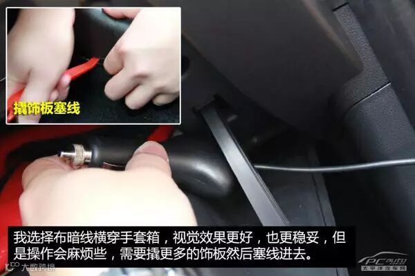 第二,继续布暗线横穿手套箱,再走明线到达点烟器。我选择的是第二种方法,因为这样布线的视觉效果更好,也更稳妥,但是操作也会更麻烦。