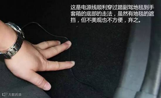 当电源线顺利穿过踏板的空隙后,接下来的布线将有两种选择:第一,直接穿过地毯到手套箱的底部,找位置固定电源线,最后走明线到达点烟器。