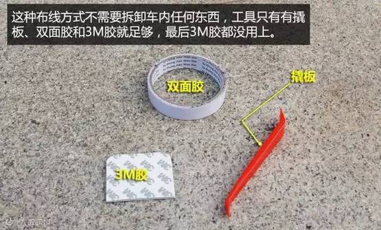 由于这种布线方式不需要拆卸车内任何东西,因此工具只有简单的三样:撬板、双面胶和3M胶。撬板可以轻松地将行车记录仪的线收在饰板里面;当然,如果你觉得自己的手劲惊人,那么完全可以不用撬板,直接用手也能完成布线。双面胶是用来黏住其中一段电源线的,下文会提到。至于3M胶则可以用来固定行车记录仪底座,还可以固定较大的线束。